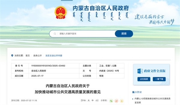 2025年7月22日,内蒙古自治区人民政府印发《关于加快推动城市公共交通高质量发展的意见》,提出各地区要积极推进公交专用道设置,加大对违法占用公交专用道、违法停靠公交站等行为的查纠力度。要通过优化通行信号系统功能等方式,在信号控制中为公交车提供绿灯早启或延长绿灯时间,在具备条件的路口允许公交车使用右转道左转,提升公交系统的整体运行效率。在重点城市内改建一批港湾式公交站,提高港湾式公交站设置比例。鼓励公交“进医院、进校园、进园区”,缓解路面交通压力。
