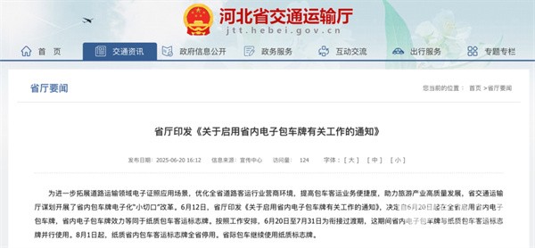 据河北省交通运输厅消息,从2025年6月20日起在全省启用省内电子包车牌,2025年6月20日至7月31日为衔接过渡期,期间省内电子包车牌与纸质包车客运标志牌并行使用。2025年8月1日起,纸质省内包车客运标志牌将在河北省全省停用。省际包车继续使用纸质标志牌。