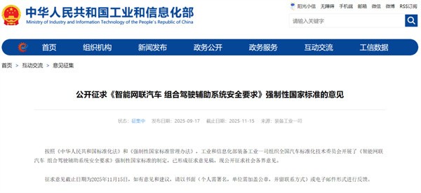 2025年9月17日,工业和信息化部就《智能网联汽车 组合驾驶辅助系统安全要求》强制性国家标准公开征求意见。按照《中华人民共和国标准化法》和《强制性国家标准管理办法》,工业和信息化部装备工业一司组织全国汽车标准化技术委员会开展了《智能网联汽车 组合驾驶辅助系统安全要求》强制性国家标准的制定,已形成征求意见稿,现公开征求社会各界意见。征求意见截止日期为2025年11月15日。