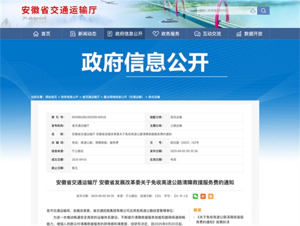 2025年9月5日,安徽省交通运输厅、安徽省发展改革委发布《关于免收高速公路清障救援服务费的通知》,明确自2025年9月20日起,免收高速公路清障救援服务费,包含对故障车辆和事故车辆的拖车费、吊车作业费。对停留在高速公路主线上(含进出口收费站以内区域)因电器电路、机械故障、事故原因无法行驶的车辆,或因驾驶员受伤等无人驾驶的车辆,清障救援机构应当以“及时消除路面通行风险”为原则,对故障车辆免费拖移至最近的高速公路出口处或服务区;对事故车辆免费拖移至公安交通管理部门指定地点;因车辆缺少燃料(油、气、电)等非故障、事故原因停留在主线上的车辆,不属于免费救援范围;清障救援机构开展高速公路清障救援作业时,对故障车辆和事故车辆确有必要进行起吊作业的,免收吊车费用;不进行拆装抢修作业无法拖(吊)车辆的,或施救涉及驳货、乘客转运、拆装、切割、换胎、抢修等劳务性服务费用不属免费范围。