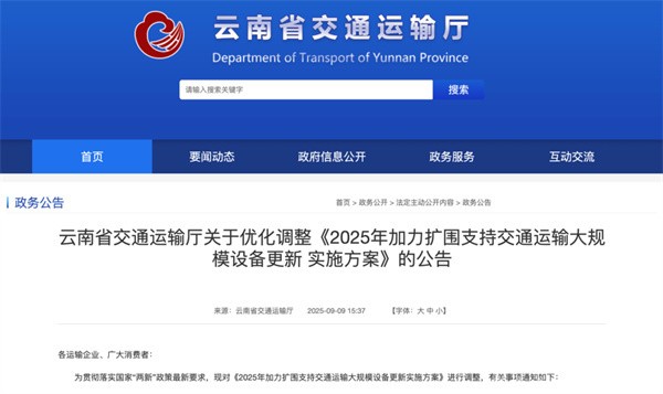 2025年9月9日,云南省交通运输厅发布《关于优化调整<2025年加力扩围支持交通运输大规模设备更新实施方案>的公告》,从2025年9月15日(含当日)起,补贴资金及补贴名额根据国家和云南省资金分配情况制定每月每周每工作日资金和补贴名额限额使用计划。补贴资金每工作日投放约50万元,工作日上午10:00开放申请,先领先得,用完为止。