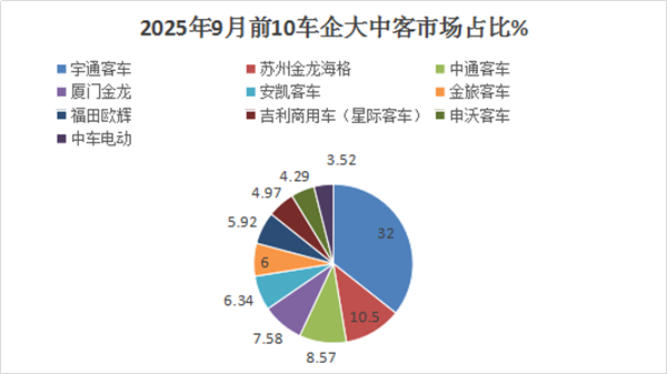上图表可见,在2025年前9月我国6米以上大中型客车销量TOP10市场占比及占比同比增减中,呈现以下特征: