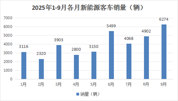 上图可见,2025年9月我国大中型新能源客车销量6274辆,创下今年1-9月各月新高,说明2025年新能源客车市场的“金九”旺季如约而至!
