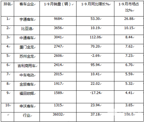 ---比亚迪客车累计销量3656辆,居第二,同比增长10.19%,跑输大盘;市场占比10.15%;