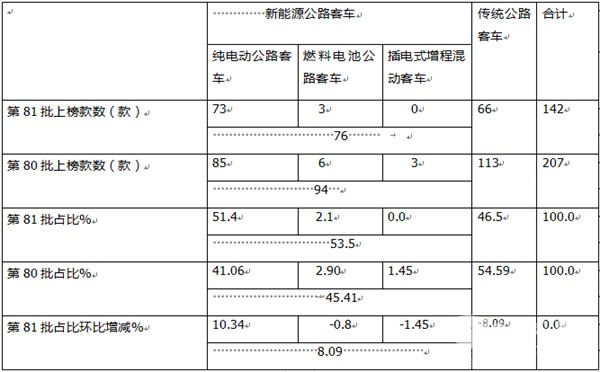 表1,第81批交通部达标车型公告上榜的各动力车型数量、占比与上一批环比(数据来源:交通部)