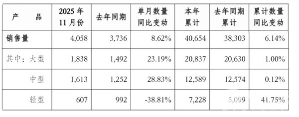 2025年1-11月宇通累计销量中,宇通客车累计销售各类车型40654辆,同比增长6.14%。其中,大型客车累计销售20837辆,同比增长1.00%;中型客车累计销售12589辆,同比微增0.12%;轻型客车累计销售7228辆,同比大涨41.75%。