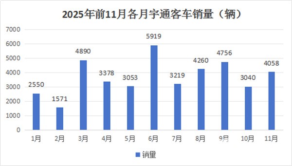 根据宇通产销快报数据,2025年1-11月各月宇通客车销量: