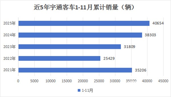 上图可见,2025年1-11月宇通客车累计销量40654辆(同比增长6.14%),创下近5年同期最高,因此也成为2025年前11月宇通客车销量的一个突出特点。