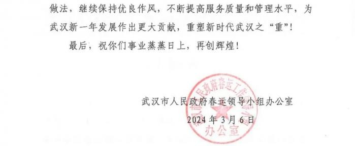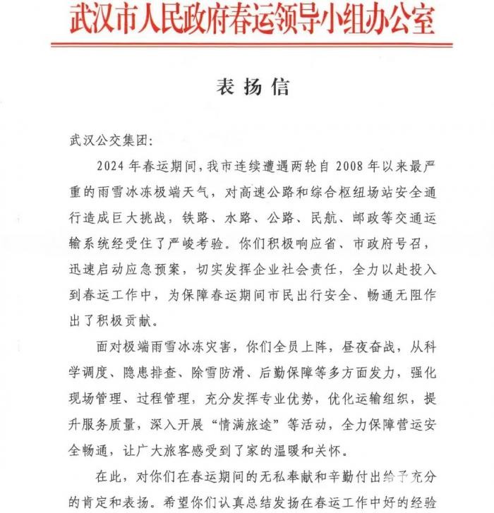 江南网页版2024年3月12日获悉,武汉公交集团收到武汉市人民政府春运领导小组办公室发来的表扬信。信中对武汉公交集团在2024年春运工作中切实发挥企业社会责任,全力以赴为保障市民出行安全、畅通无阻所作的贡献给予充分的肯定和表扬。