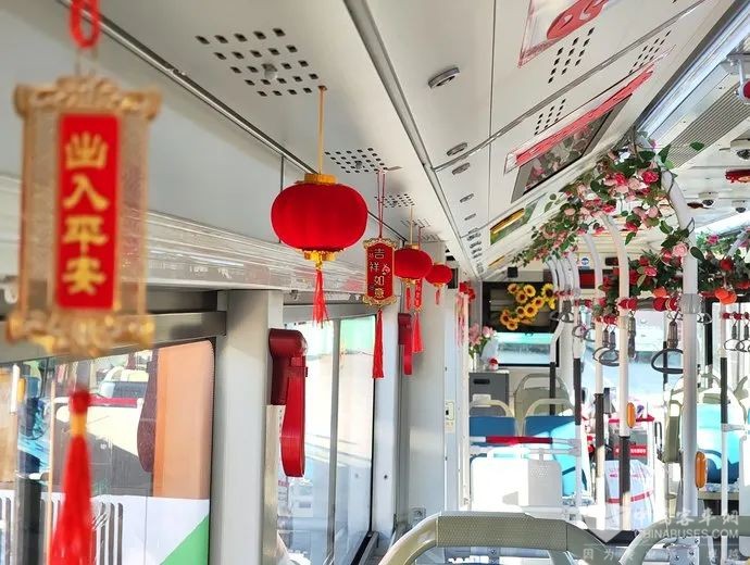 据周海燕介绍,该“年味公交”主要以新年主题装饰和鲜花绿植为主色调。步入车厢内部,映入眼帘的便是一片喜庆祥和的景象,圆润的红灯笼代表着我们对新年的一份美好祝愿,更是对来年美好生活的殷殷期盼;鲜花和绿植则彰显了满满的春天气息,为乘客带来了赏心悦目的视觉体验;车厢两侧张贴的一幅幅精美剪纸,不仅展示着新年里的团圆与幸福,更彰显了来自民间艺术的独特魅力。