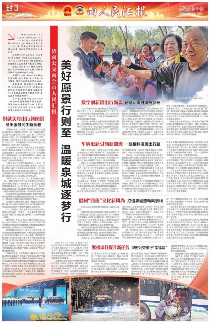 “市民有需求,公交有响应。”截至2024年年底,济南公交通过科学规划与创新实践,累计开通优化公交线路50余条,填补公交线网空白80余公里;开通优化轨道交通沿线公交线路26条,接驳线路达210条,同时持续开通高峰通勤巴士、社区公交、定制公交等特色线路,满足市民多元化出行需求,提升了市民乘客公交出行的体验感,也绘就了市民美好出行的新蓝图。一辆辆公交车,满载着幸福与欢笑,穿行于街巷阡陌,不断织密市民乘客美好出行的幸福路。