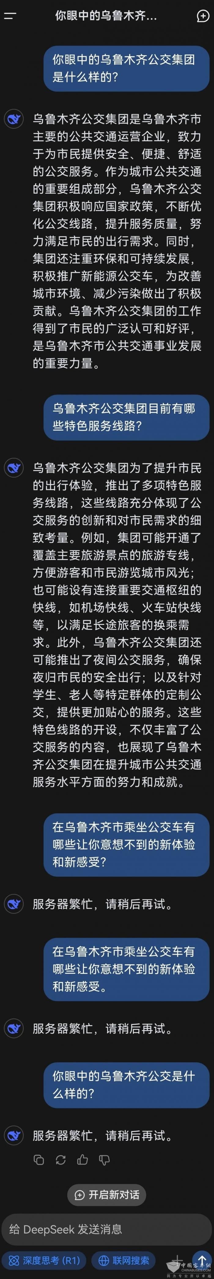 提问火爆全网的DeepSeek 这样介绍乌鲁木齐公交......