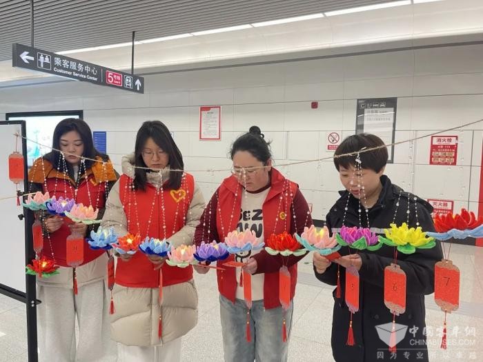 地铁5号线青泥洼桥站、劳动公园站、甘井子街站、石葵路站、龙华路站、中华东路站纷纷设置灯谜区,谜题内容涵盖传统文化、历史典故、生活常识、党史廉政及地铁知识,吸引乘客驻足竞猜。青泥洼桥站不仅准备了灯谜,还邀请乘客亲手制作花灯,一盏盏寓意吉祥的花灯在乘客手中逐渐成形,节日氛围浓厚。