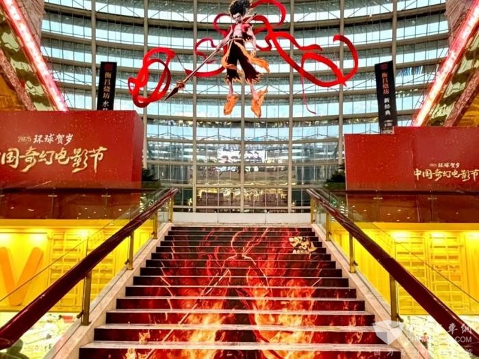 “大吒”来啦!走进环球中心大门,近两层楼高的10米巨型“哪吒”人形立牌悬挂在穹顶上方,十分吸引眼球,立牌下通往负一楼的楼梯上也贴上了肉身重塑成功后的哪吒的形象,上下呼应一整个氛围感拉满,霸气十足!人形哪吒的大海报人形立牌配上炫酷大海报,简直不要太出片啦~悄悄告诉您,仰拍角度+广角镜头,分分钟get电影海报同款大片!