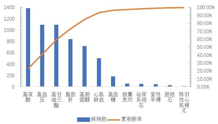 以某公交公司驾驶员为分析样本,对2019年体检中存在的慢性病例情况进行统计,并按照病例出现频次由高到低进行了统计汇总,见表1。其中前六项慢性病累积出现频率达到93.68%,为需要重点关注的城市公交驾驶员常见慢性病,按照病例数排序由高到低分别为高尿酸、高血压、高甘油三酯、脂肪肝、高胆固醇和心肌缺血。以因素1~12为横坐标,分别以各因素出现次数和累积频率为主/副纵坐标,绘制双坐标图,见图1。