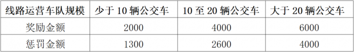 以EWT指标为例,在考核范围内,运营商每将一条线路的EWT减少(或增加)0.1分钟,会收到相应的奖励(或惩罚)。由于运营线路车辆越多,EWT的调整难度越大,所以奖惩金额也会相应增加。