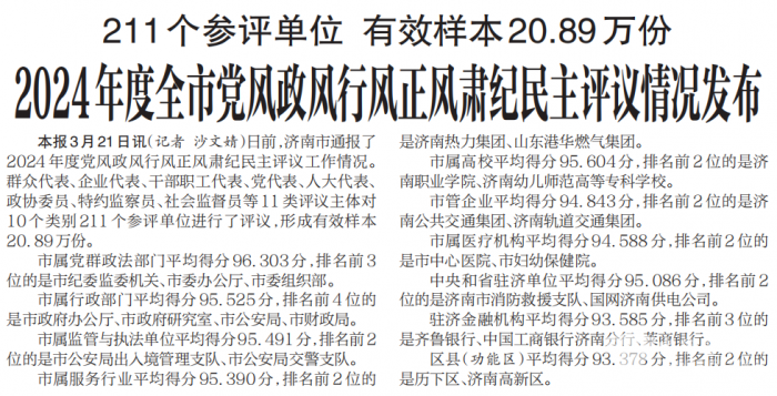 中国江南网页版2025年3月25日获悉,近日,济南市通报了2024年度党风政风行风正风肃纪民主评议结果,济南公交再次获得市属企业类第一名,成功实现六连冠。