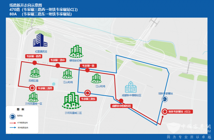 早晚高峰期间,470路与80A同步开行,在现有80A服务范围基础上,通过470路进一步扩大韦家碾片区服务半径,形成互补,居民最快5分钟就可直达地铁站,提高乘客通勤效率,解决韦家碾片区多个小区居民“最后一公里”通勤痛点。