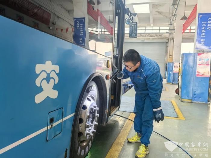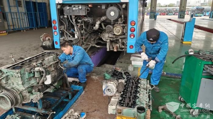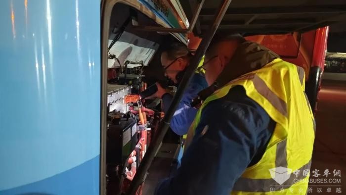 凌晨的车间,修理工做好车辆重点部位的检修工作,确保首班车准时发出。