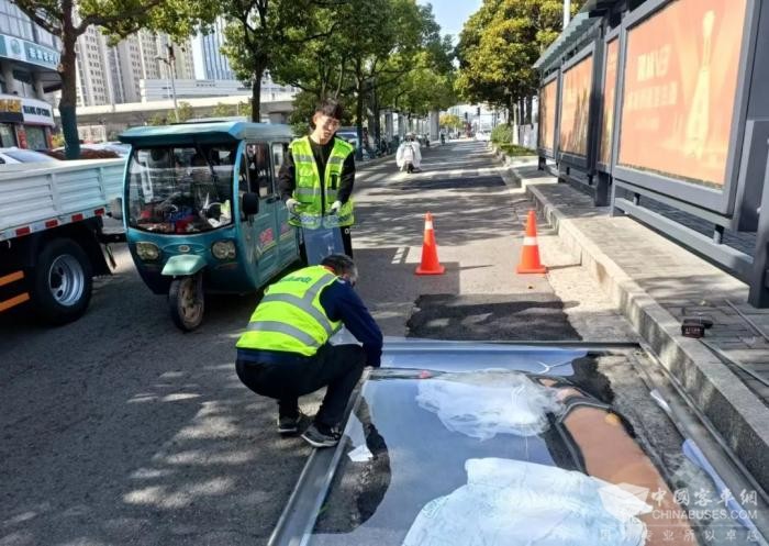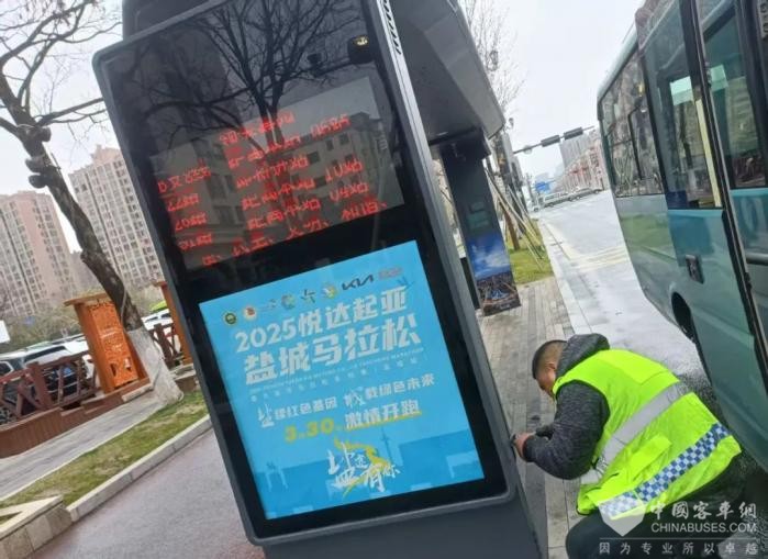 赛前,公司安排专人对所有参加赛事保障公交车辆的技术状况和安全性能进行全面检查,确保车辆技术性能良好。对公交站台的电力、照明等设备进行全面排查整改,对锈蚀严重的站台进行喷漆出新,对损坏的灯箱板材进行及时更换、加固,确保站台在赛事期间的安全稳定运行。同时,在赛道沿线的公交站台投放赛事公益广告画面,渲染浓烈的赛事氛围,展示盐城的美好城市形象。