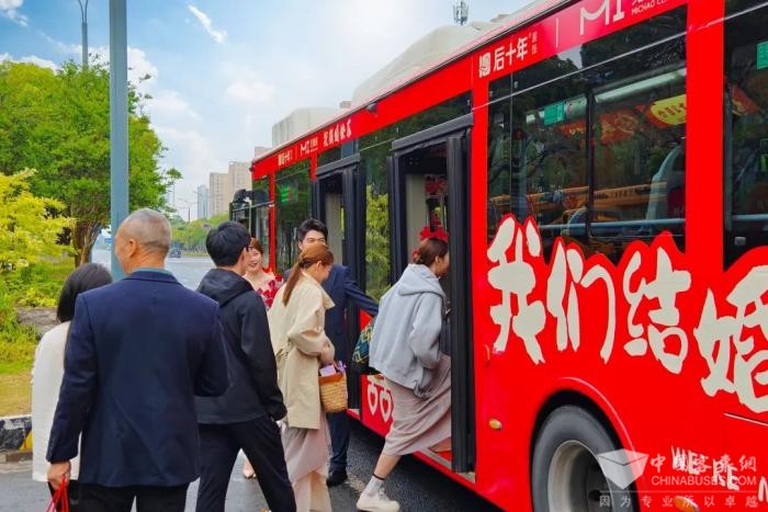 当天,一辆车身印有醒目“囍”字和新人姓名的红色公交婚车缓缓驶过城区。车头LED屏滚动播放由“琴瑟和鸣”开往“永结同心”的520专线字样,车窗贴满传统剪纸喜花,车内装饰了众多婚礼喜庆元素,营造出温馨浪漫的氛围。