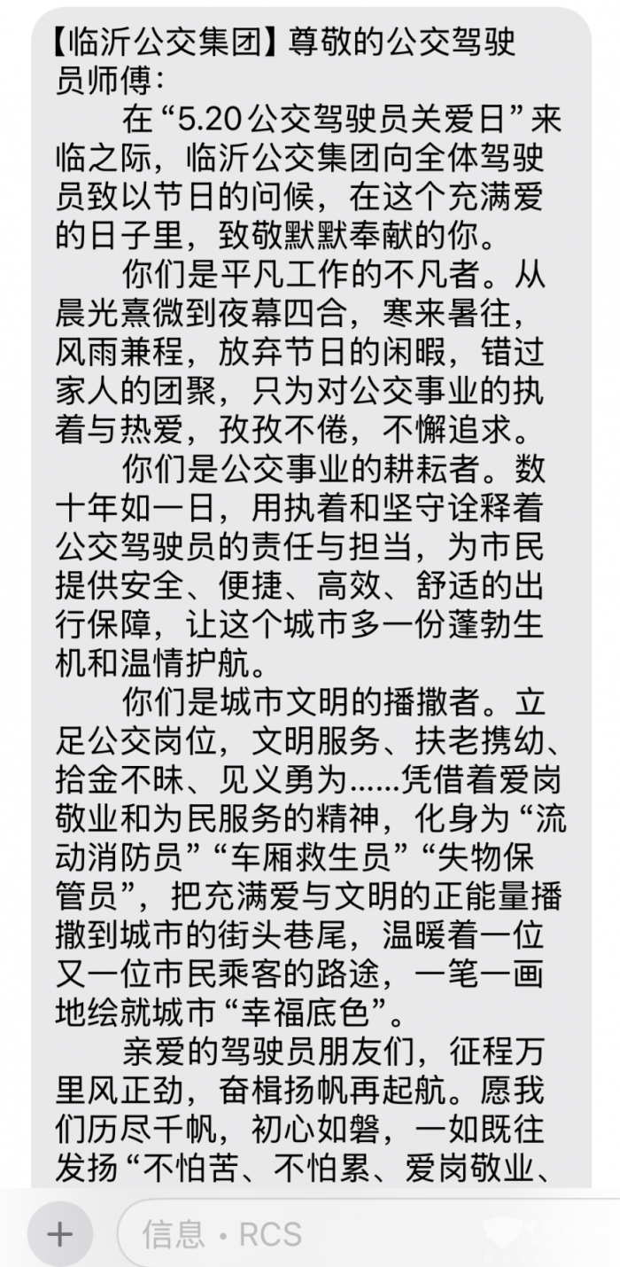 一条充满祝福的短信。临沂公交集团以简单朴实的形式向公交驾驶员致以节日的祝福,感谢公交驾驶员一直以来的辛勤工作和卓越贡献,让驾驶员们充分感受到公交大家庭的温暖,度过温馨而美好的专属节日。