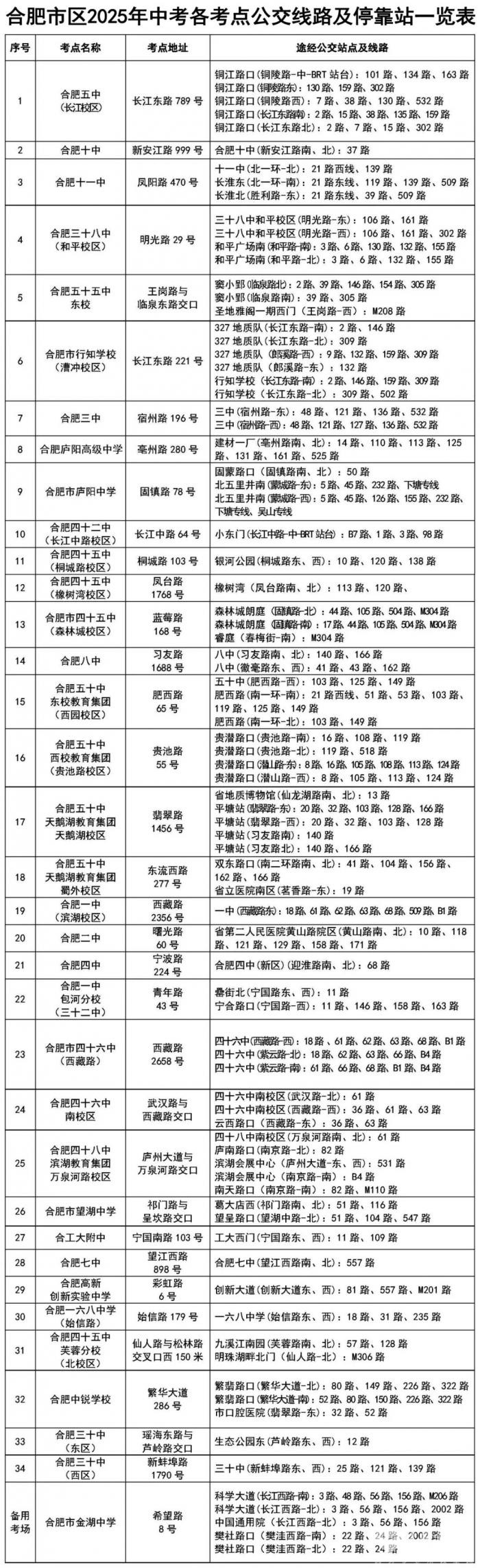 为方便广大考生中考期间顺利出行,合肥公交集团逐一列出途经省城34个考点及1个备用考点的公交线路、停靠站点,方便考生乘坐公交车赶赴考场应试。考生及家长若更进一步了解线路及站点情况,可拨打合肥公交李祥斌热线0551-96166咨询。