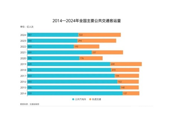全国客运数据印证这一趋势。2014年全国公共汽电车客运量高达723亿人次,随后一路下滑,2022年仅剩353亿人次,不到高峰期一半。2024年略有回升,但也只有387亿人次,十年间流失约336亿人次。