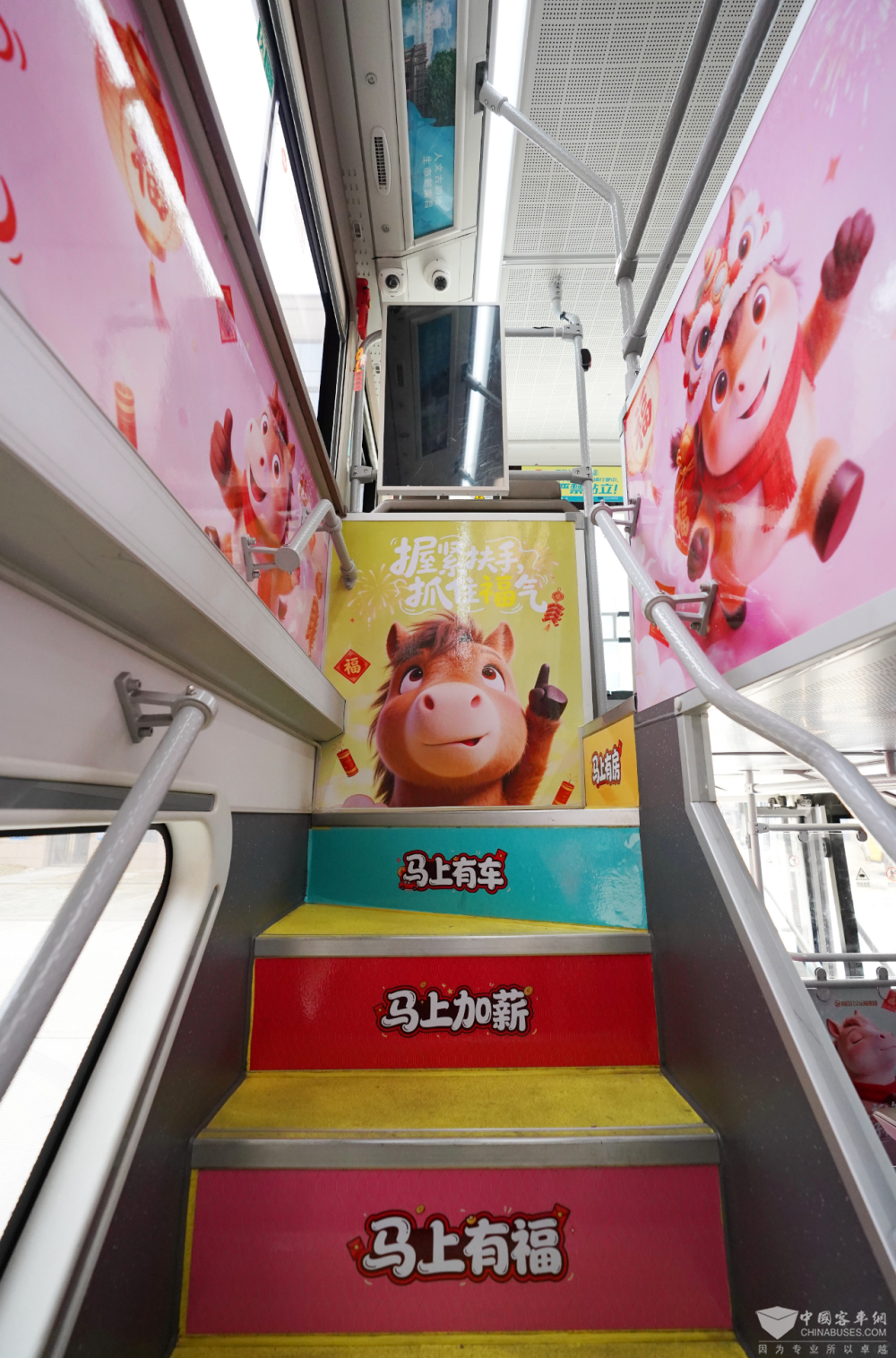 据悉,本次推出的“神马巴士”主题车以“2026,跑出你的神马速度”为核心主题,车身采用红金撞色设计,奔腾的红色骏马搭配祥云、鎏金纹理等传统新春元素,将马年“龙马精神、策马扬鞭”的美好寓意与现代城市出行场景深度融合,行驶在街头即是一道流动的新春风景线。车厢内打造了多个马年主题打卡点,楼梯台阶贴有“马上成功”“马上顺利”等彩色吉祥语贴纸,市民乘车时,每一步都踩在新春祝福里;楼梯过道的粉色主题壁画上,萌趣小马搭配福字、灯笼、烟花等元素,以及“握紧扶手 抓住福气”的趣味提示牌,让整个车厢成为可触摸、可打卡的沉浸式新春空间。