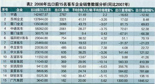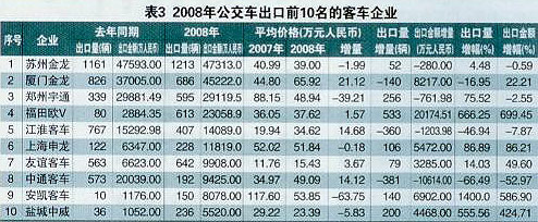 3. 2008年公交车出口前10名的客车企业的具体数据如表3。