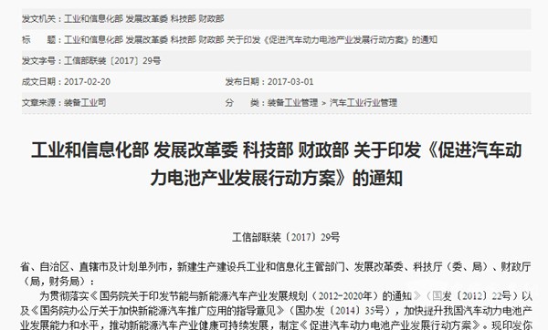 四部委关于印发《促进汽车动力电池产业发展行动方案》的通知