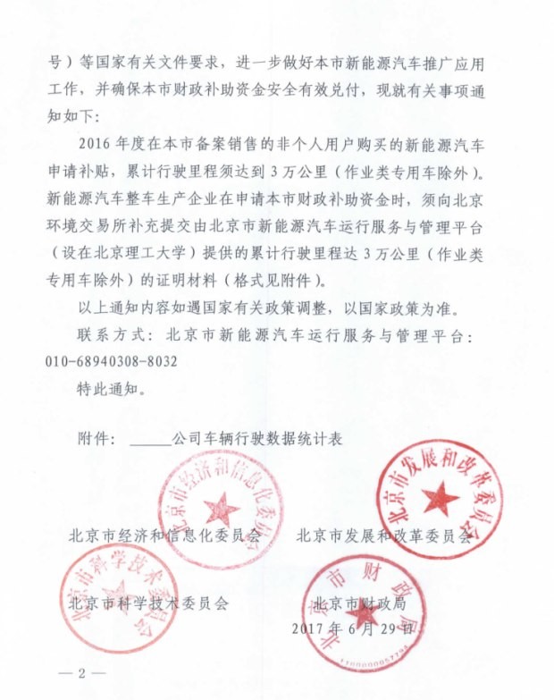 2017年7月25日消息,北京市经信委发布《关于进一步做好2016年度北京市推广应用新能源汽车市级财政补助资金兑付工作的通知》,该通知中明确表示,2016年度在北京市备案的非个人用户购买的新能源汽车申请补贴时,须达到3万公里的累计行驶里程(作业类专用车除外)。