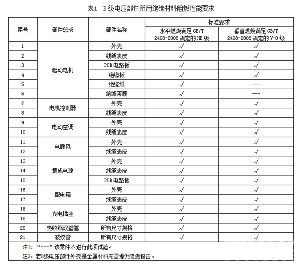 B级电压部件的材料分类和燃烧特性技术要求满足表1的规定。
