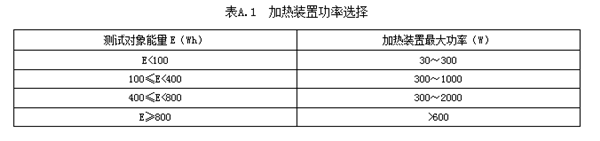 A.3.2 使用平面状或者棒状加热装置,并且其表面应覆盖陶瓷,金属或绝缘层,加热装置的功率要求见表A.1。完成测试对象与加热装置的装配,加热装置与蓄电池单体应直接接触,加热装置的尺寸规格应不大于测试对象的被加热面;安装温度监测器,监测点温度传感器布置在远离热传导的一侧,即安装在加热装置的对侧(如图A.1)。温度数据的采样间隔应小于1 s,准确度要求为±2 ℃,温度传感器尖端的直径应小于1 mm。