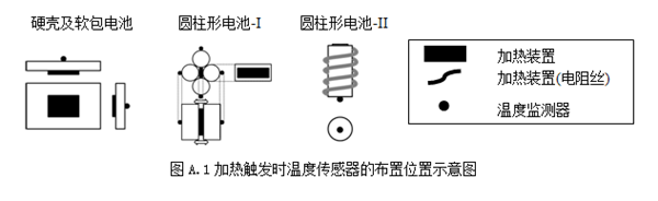A.3.3 将测试对象充电到SOC=100%后,再对测试对象用1C电流继续充电12 min。立刻启动加热装置,并以其最大功率对测试对象进行持续加热,当发生热失控或者A.3.2定义的监测点温度达到300 ℃时,停止触发,关闭加热装置。