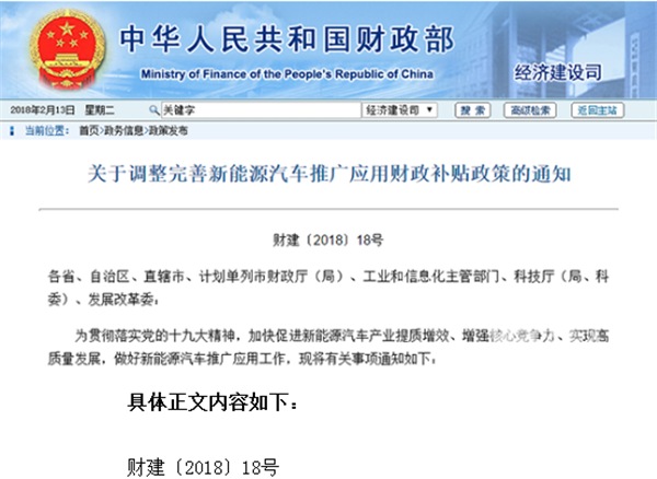 当然,2月份最重磅,同样也是全年最重磅的政策,无疑要数同样在2018年2月13日(即春节前两天),由财政部、工信部、科技部、发改委四部委联合发布《关于调整完善新能源汽车推广应用财政补贴政策的通知 》,以及同时发布《新能源汽车推广补贴方案及产品技术要求》。