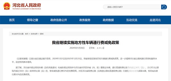 江南网页版获悉,经河北省政府同意,省交通厅、省发改委、省财政厅联合印发通知,决定自2024年1月1日起到2025年12月31日,继续在河北省实施地方性车辆通行费减免政策,进一步提高河北省公路网通行效率和服务水平,促进物流降本增效。