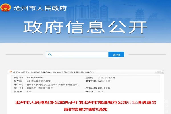 沧州市发布《推进城市公交行业高质量发展实施方案》