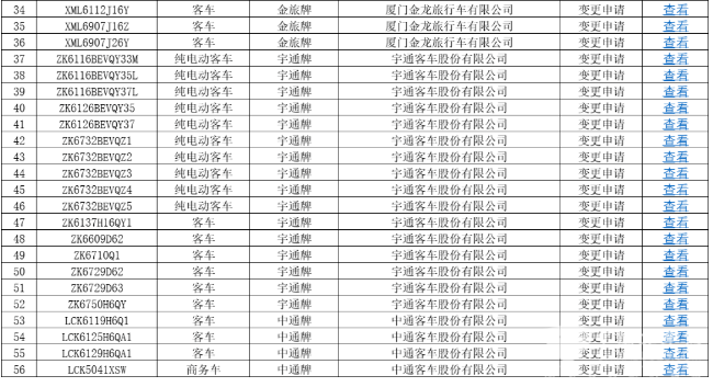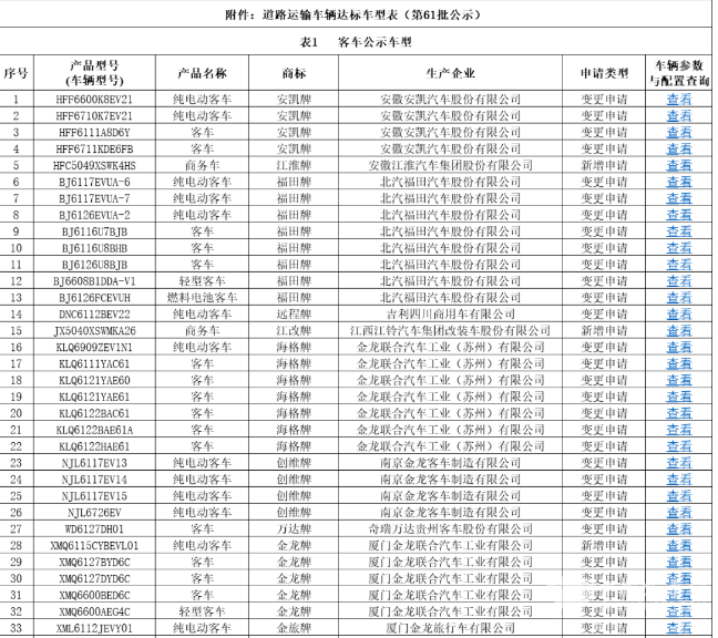 上图可见,在交通部第61批上榜的达标的道路运输客车车型公告中: