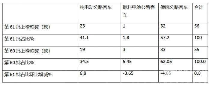 表1,第61批交通部达标车型公告上榜的各动力车型数量、占比与上一批环比(数据来源:交通部)