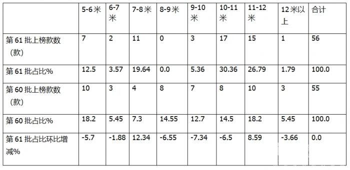 表3,根据交通部数据,第61批客车达标车型公告中上榜的各长度段车型数量、占比比及环比增减统计: