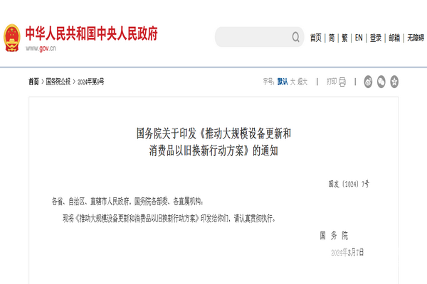 2024年3月13日,国务院印发了关于《推动大规模设备更新和消费品以旧换新行动方案》的通知(国发〔2024〕7号)。