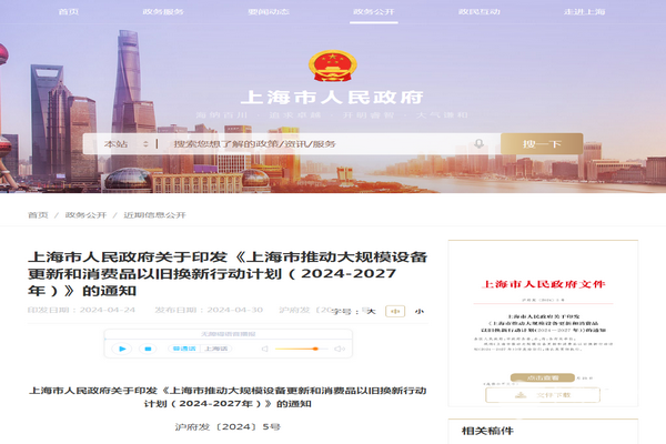 2024年4月23日,上海市人民政府印发了关于《上海市推动大规模设备更新和消费品以旧换新行动计划(2024-2027年)》的通知(沪府发〔2024〕5号)。