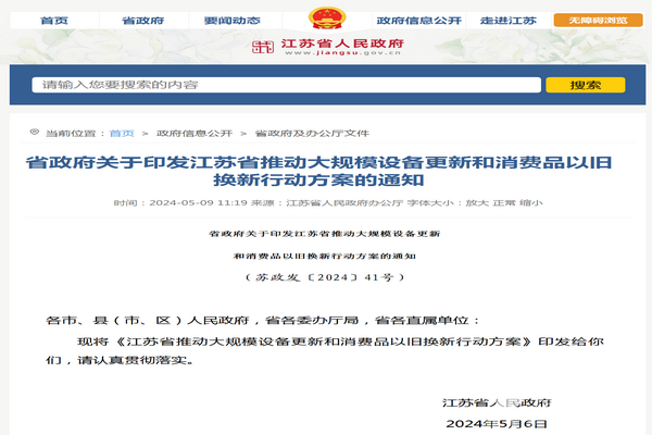 2024年5月6日,江苏省人民政府印发了关于《江苏省推动大规模设备更新和消费品以旧换新行动方案》的通知(苏政发〔2024〕41号)。