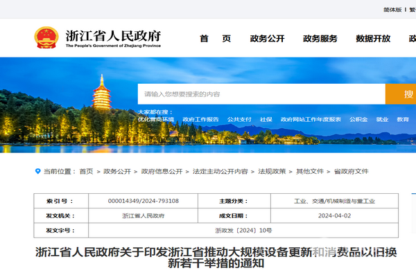2024年4月9日,浙江省人民政府印发了关于《浙江省推动大规模设备更新和消费品以旧换新若干举措》的通知(浙政发〔2024〕10号)。