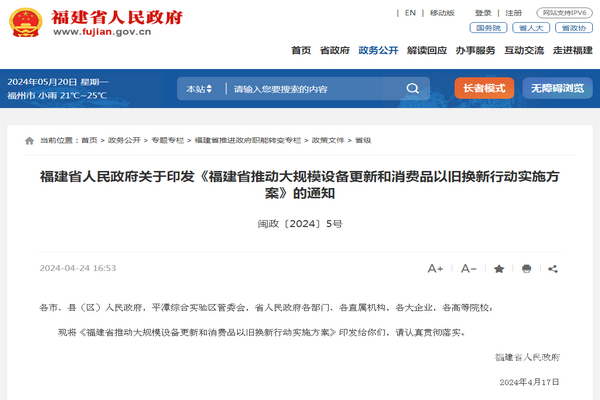 2024年4月17日,福建省人民政府印发了关于《福建省推动大规模设备更新和消费品以旧换新行动实施方案》的通知(闽政〔2024〕5号)。