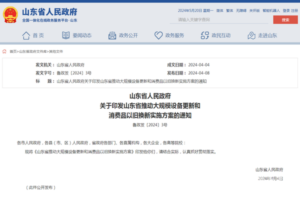 2024年4月4日,山东省人民政府印发了关于《山东省推动大规模设备更新和消费品以旧换新实施方案》的通知(鲁政发〔2024〕3号)。