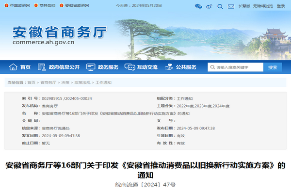 2024年5月8日,安徽省商务厅等16部门印发了关于《安徽省推动消费品以旧换新行动实施方案》的通知(皖商流通〔2024〕47号)。