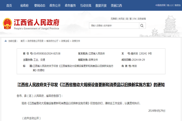 2024年4月29日,江西省人民政府印发了关于《江西省推动大规模设备更新和消费品以旧换新实施方案》的通知(赣府发〔2024〕9号)。