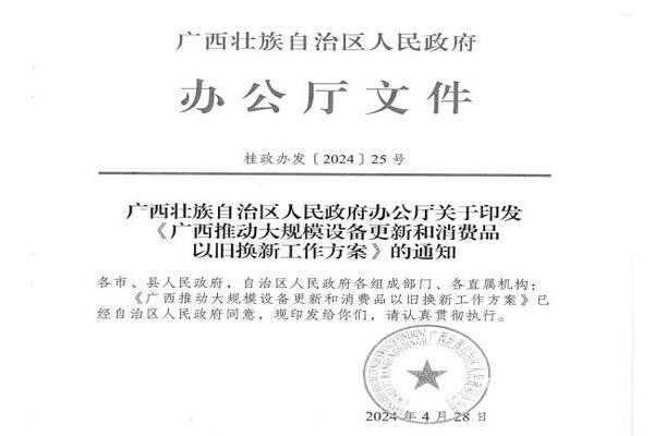 2024年4月28日,广西壮族自治区人民政府印发了关于《广西推动大规模设备更新和消费品以旧换新工作方案》的通知(桂政办发〔2024〕25号)。